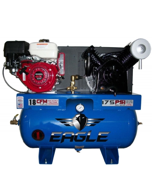 Eagle 9G30TRK E 30 Gallon ASME horizontal stationary capacity tank. 9 HP Honda GX270 manual/electric gas engine with ideal control. Cast iron cylinders with V design. Oil lube compressor delivers 18 CFM 100 PSI. 175 Max PSI. Easy view oil sight gauge. Metal air filers with “auto drop” feature. Outlet control regulator with quick connectors. Efficient heat removal from the fly wheel for cooler running and longer life. Sturdy metal belt guard. Outlet valve included.