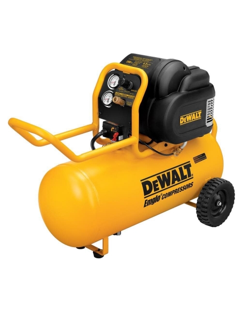 The DEWALT heavy-duty 200 PSI portable air compressor is a powerful yet quiet portable air compressor with a quick recovery time and an oil-free, maintenance-free pump that can run with an extension cord. The durable handle makes it easy to roll or carry this portable air compressor and doubles as a hose wrap. Other features include a high-flow coupler and air regulator to maximize air-tool run time and a durable metal console with easy-to-read gauges.