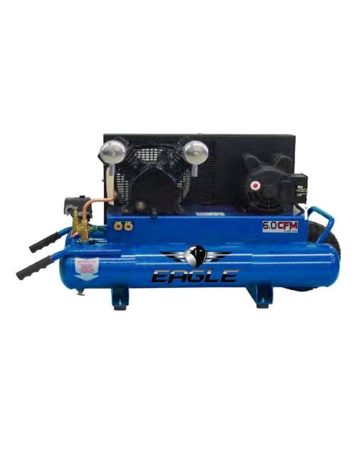 Eagle TT318E-DV 8 Gallon capacity tank. 3 HP single phase 110/220 dual volt electric motor. Oil lube compressor delivers 6 CFM 100 PSI. 150 max PSI. Easy view oil sight gauge. Metal air filers with “auto drop” feature. Outlet control regulator with quick connectors. Efficient heat removal from the fly wheel for cooler running and longer life. Sturdy metal belt guard. Steel rim pneumatic tire for easy handling.