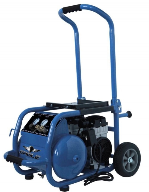Eagle silent series ea-6000 6 Gallon tank 2.5 HP compact compressor. Low RPM induction motor runs at a quiet 53 DB 25feet. Twin cylinder oil free compressor delivers 7.9 CFM 40 PSI and 6.0 CFM 90 PSI. Easy access control panel has quick connect and regular with gauges.125 Max PSI. Lever type tank drain. Heavy duty pressure switch. Includes intrigued wheel kit for easy mobility.