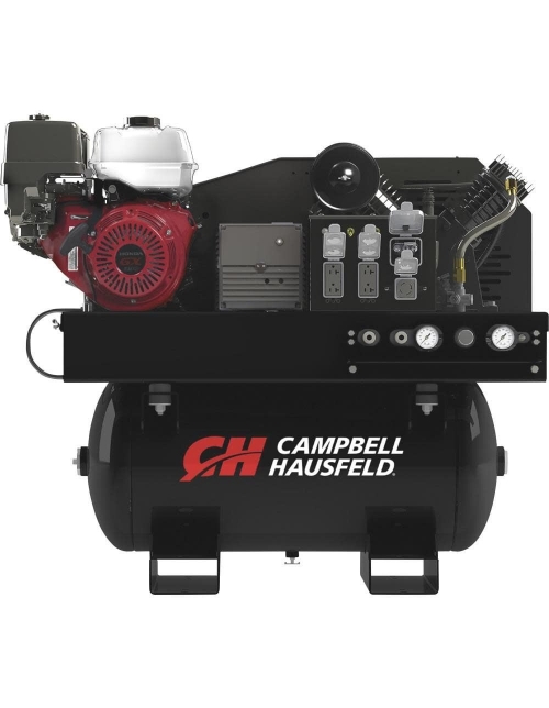 The Campbell Hausfeld 2-in-1 air compressor/generator (GR2200) is ideal for jobsites and work trucks, delivering 14 CFM of airflow at 90 PSI to drive a wide variety of air tools, plus providing 5,000 watts of 120V and 240V AC power to operate electrical tools, lights and more. A reliable Honda GX-390 engine powers this unit, which features a two-stage, cast-iron air compressor that’s designed for high output and industrial reliability. A 30-gallon tank provides ample air capacity for a wide variety of applications. Built with safety in mind, this air compressor/generator has a control panel that’s UL certified and OSHA compliant; the electrical outlets are GUCCI protected. A heavy-duty, 14-gauge steel belt guard is securely bolted to the unit, but can be quickly removed to provide access to routine maintenance items.