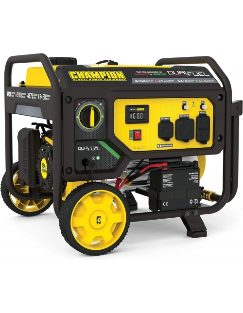 The Champion Power Equipment 201052 3800-Watt Dual Fuel Portable Generator is the perfect combination of versatility and convenience. Whether you need power for your home or next project, Champion Power Equipment makes powering your life more convenient than ever. The convenient electric start includes a battery, plus Cold Start Technology ensures a quick start in cold weather. Easily monitor power output and track maintenance intervals with Intelligauge, which allows you to keep track of voltage, hertz and run-time hours. Designed with a low oil shut-off sensor, this unit includes 0.6-quarts of 10W-30 oil. Operate your Dual-Fuel generator right out of the box on gasoline or propane, and easily switch fuels with our patented fuel select dial that allows for safe switching between fuel sources. Using gasoline, the 224cc Champion engine produces 4750 starting watts and 3800 running watts, and will run for 14 hours at 50% load when the 4.7-gallon fuel tank is full. It produces 4275 starting watts and 3420 running watts, and will run for 10.5 hours at 50% load when using a 20-pound propane tank. Also included is a 6.5-foot propane hose with a built-in regulator. With a noise level of 68 dBA from 23 feet, which is a bit louder than a vacuum, this machine can provide home backup in an outage, plus the Volt Guard™ protects your generator from electrical voltage spikes. All the outlets have covers for protection and include a 120V 30A (TT-30R) RV outlet, a 120V 30A outlet (L5-30R), and two 120V 20A household outlets (5-20R). Champion’s thoughtful packaging and clear directions make setup hassle free, plus the foldaway U-shaped handle makes it easy to store, while the never-flat tires in the included wheel kit make transport a cinch. Buy this EPA certified and CARB compliant generator with confidence – Champion Support and our nationwide network of service centers will back up your purchase with a 3-year limited warranty and FREE lifetime technical support.