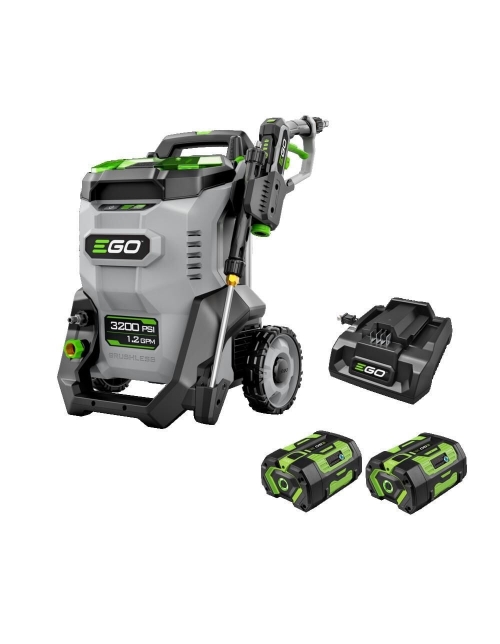 The EGO POWER+ 3200 PSI Pressure Washer is the industry’s most powerful cordless pressure washer. Featuring Peak Power technology, this cordless electric pressure washer combines the power of any two EGO POWER+ 56V ARC Lithium batteries to deliver up to 3200 PSI at 1.2 GPM—and up to 2.0 GPM max—for powerful and efficient cleaning. It delivers up to 60 minutes of runtime on a single charge with two included 6.0Ah ARC Lithium™ batteries. Handheld pressure control allows you to select ECO, High, and Turbo modes as well as view battery charge status via the display integrated into the wand. Quick-connection points for hoses and the wand allow easy setup, breakdown, and nozzle changes. A telescopic handle pulls out for easy transport and collapses for compact storage. The power washer comes with a flexible high-pressure hose, siphon hose, 15-degree nozzle, 25-degree nozzle, 40-degree nozzle, turbo nozzle, rinse nozzle, quick-connect short pressure washer gun, quick-connect wand lance, stainless steel wand, foam cannon, and filter. The portable pressure washer can draw from a fresh water source like a bucket when used with the included siphon hose. Clean with Power Beyond Belief™ with the EGO POWER+ 3200 PSI Pressure Washer.