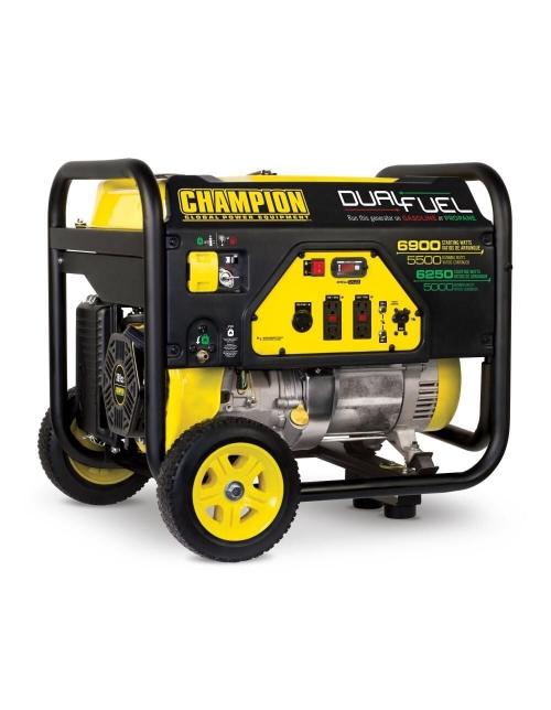 Champion Power Equipment 100231 5500-Watt dual fuel portable generator with wheel kit is designed with versatility and convenience in mind. An ideal companion for your next weekend project or wherever you might need additional power, this generator can also provide plenty of backup power for your home during an outage. Operate your dual-fuel generator right out of the box on gasoline or propane, and easily switch fuels with our patented fuel selector switch that allows for safe switching between fuel sources. Using gasoline, the 389cc Champion engine produces 6900 starting watts and 5500 running watts, and will run for 10 hours at 50% load when the 6.0 Gallon fuel tank is full. When using a 20 Lb. propane tank, it produces 6250 starting watts and 5000 running watts, and will run for 6.5 hours at 50% load. Also included is a 3.3 Ft. propane hose with a built-in regulator. With a noise level of 74 dBA from 23 Ft., which is a bit louder than a vacuum, this machine features Cold Start technology to ensure a quick start in cold weather. Volt Guard built-in surge protector prevents overloads and keeps your equipment safe from spikes in voltage, while the Intelligauge monitors voltage, frequency and operating hours. Outlets include one 120/240 V 30A locking outlet (L14-30R) and four 120V 20A GFCI protected household outlets (5-20R). Designed for safety with a low oil shut-off sensor plus an included oil funnel, this unit has a 1.2 qt oil capacity (recommended 10W-30). Foldaway U-shaped handle and included wheel kit with never flat tires make it a cinch to move your power where you need it. Buy this EPA certified and CARB compliant generator with confidence - Champion support and our nationwide network of service centers will back your purchase up with a 3-year limited warranty and free lifetime technical support.