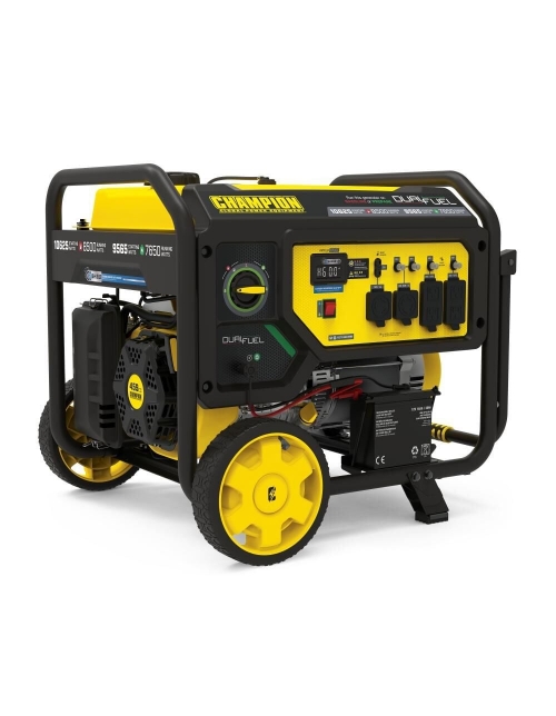 The Champion Power Equipment 201083 8500-Watt Dual Fuel Portable Generator is the perfect combination of versatility and convenience. Whether you need power for your home or next project, Champion Power Equipment makes powering your life more convenient than ever. CO Shield technology monitors the accumulation of carbon monoxide (CO), a poisonous gas produced by engine exhaust when the generator is running. If CO Shield detects unsafe elevated levels of CO gas, it automatically shuts off the engine. CO Shield is not a substitute for an indoor carbon monoxide alarm or for safe operation. DO NOT allow engine exhaust fumes to enter a confined area through windows, doors, vents or other openings. Generators must ALWAYS be used outdoors, far away from occupied buildings with engine exhaust pointed away from people and buildings. Meets the requirements of ANSI/PGMA G300-2018. The convenient electric start includes a battery, plus Cold Start Technology ensures a quick start in cold weather. Operate your Dual-Fuel generator right out of the box on gasoline or propane, and easily switch fuels with our patent pending fuel select dial that allows for safe switching between fuel sources. Using gasoline, the 459cc Champion engine produces 10625 starting watts and 8500 running watts, and will run for 10 hours at 50% load when the 7.7-gallon fuel tank is full. It produces 9565 starting watts and 7650 running watts, and will run for 5 hours at 50% load when using a 20-pound propane tank. Also included is a 6.5-foot propane hose with a built-in regulator. All the outlets have covers for protection and include 120V 30A locking outlet (L5-30R), a 120/240V 30A locking outlet (L14-30R) as well as four 120V 20A GFCI protected household outlets (5-20R). Buy this EPA and CARB certified generator with confidence – Champion Support and our nationwide network of service centers will back up your purchase with a 3-year limited warranty and FREE lifetime technical support.