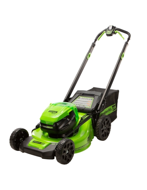 Powerfully smart. Tackle the toughest yards, one-handed, because our smart mowers never bog down. When grass gets thick, tall, or wet, Greenworks sensors tell our brushless motor to rush power to the mower blades. The end result? The perfect lawn, every time. Powerfully tough. The deck is forged with heavy-duty steel, ready to tackle any terrain. Add in algorithms and a brushless motor to reach unrivaled blade speed. Ka-pow! Powerfully easy. Simple to start with just the push of a button. Effortless to mow because it's self-propelled, no sweat! Gentle on the ears because it mows quietly. A cinch to store in small spaces, you can even hang it up if you want to. Additional features include a 4-in-1 cutting deck lets you choose your cut finish from mulching, bagging, side discharge, or turbo mode for leaf pick up