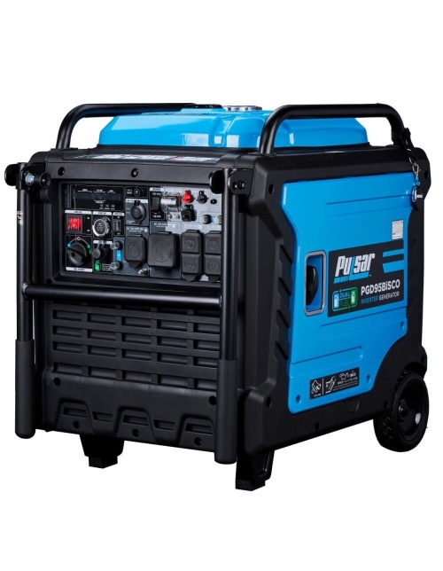 The Pulsar super quiet 9,500 peak watt, 7,600 running watt inverter generator with remote start is an ideal solution for home backup power and mobile applications such as trailers and food trucks. Safely power appliances, tools, and sensitive electronics. Its 458cc engine is mounted within a closed frame which significantly reduces operation volume. Rated at only 62 dB, this generator is ideal to use in social environments without disturbing neighbors or conversation. Dual fuel capability allows this generator to operate on gasoline or propane with low idle control to maximize run times. Operate up to 9.5 hours at half load on a single tank of gasoline. This highly versatile generator is equipped with smooth rolling never-flat wheels and fold down handles making transportation simple and convenient.