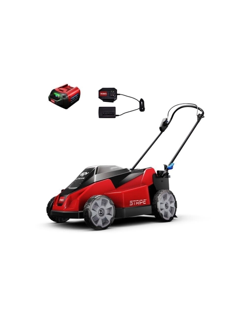 The Toro 60V Max 60V 21 In. Striping Mower. The new Toro 60V Striping mower is a patented cutting technology that allows you to get that professional look with Toro's best in class lawn striper, with nice wide stripes and a 21 In. cutting deck. The state of the art, lightweight plastic shield gives the mower the most run-time on a single charge in its class.